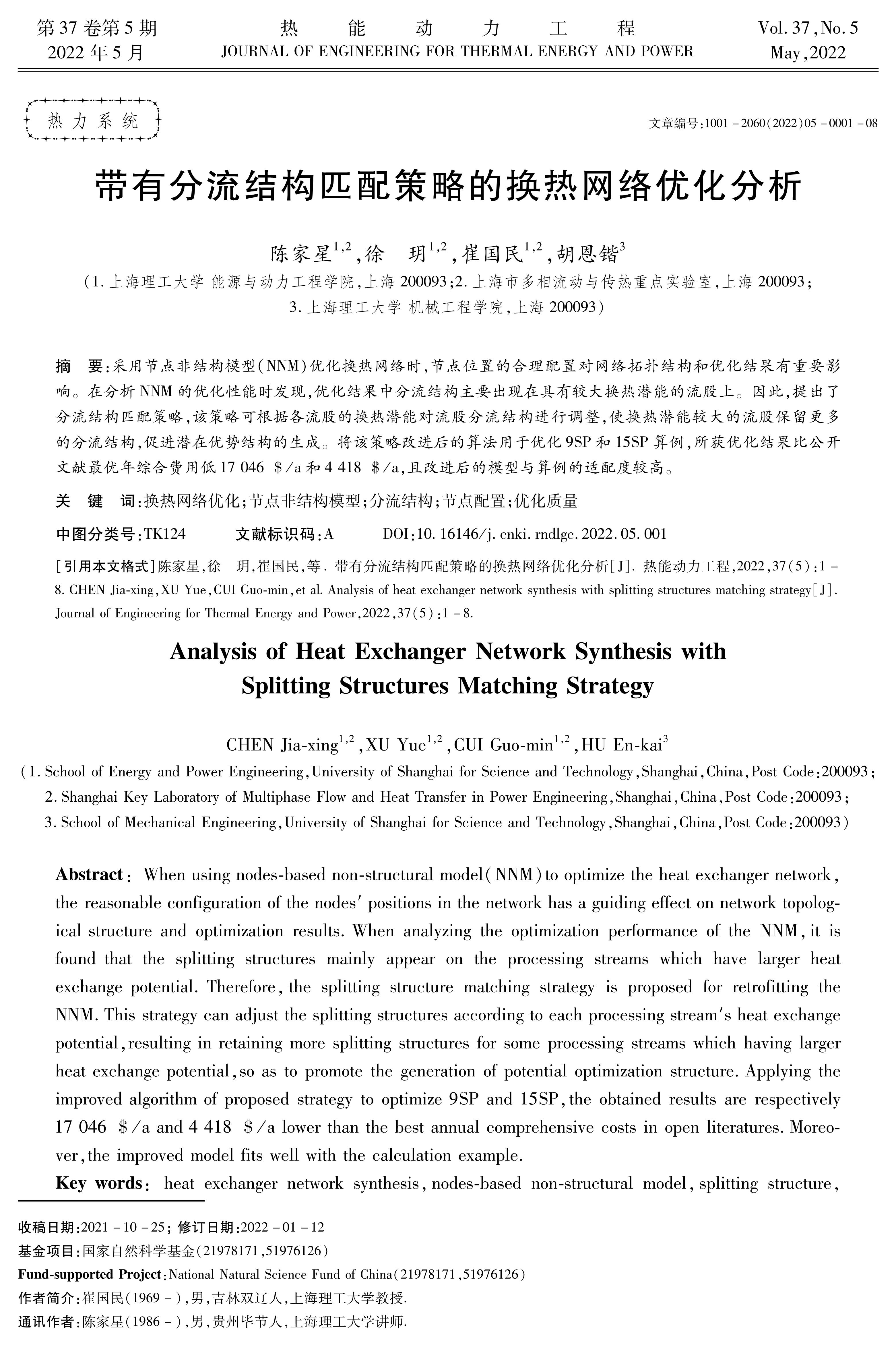 采用节点非结构模型(NNM)优化换热网络时,节点位置的合理配置对网络拓扑结构和优化结果有重要影响。在分析NNM的优化性能时发现,优化结果中分流结构主要出现在具有较大换热潜能的流股上。因此,提出了分流结构匹配策略,该策略可根据各流股的换热潜能对流股分流结构进行调整,使换热潜能较大的流股保留更多的分流结构,促进潜在优势结构的生成。将该策略改进后的算法用于优化9SP和15SP算例,所获优化结果比公开文献最优年综合费用低17 046 $/a和4 418 $/a,且改进后的模型与算例的适配度较高。