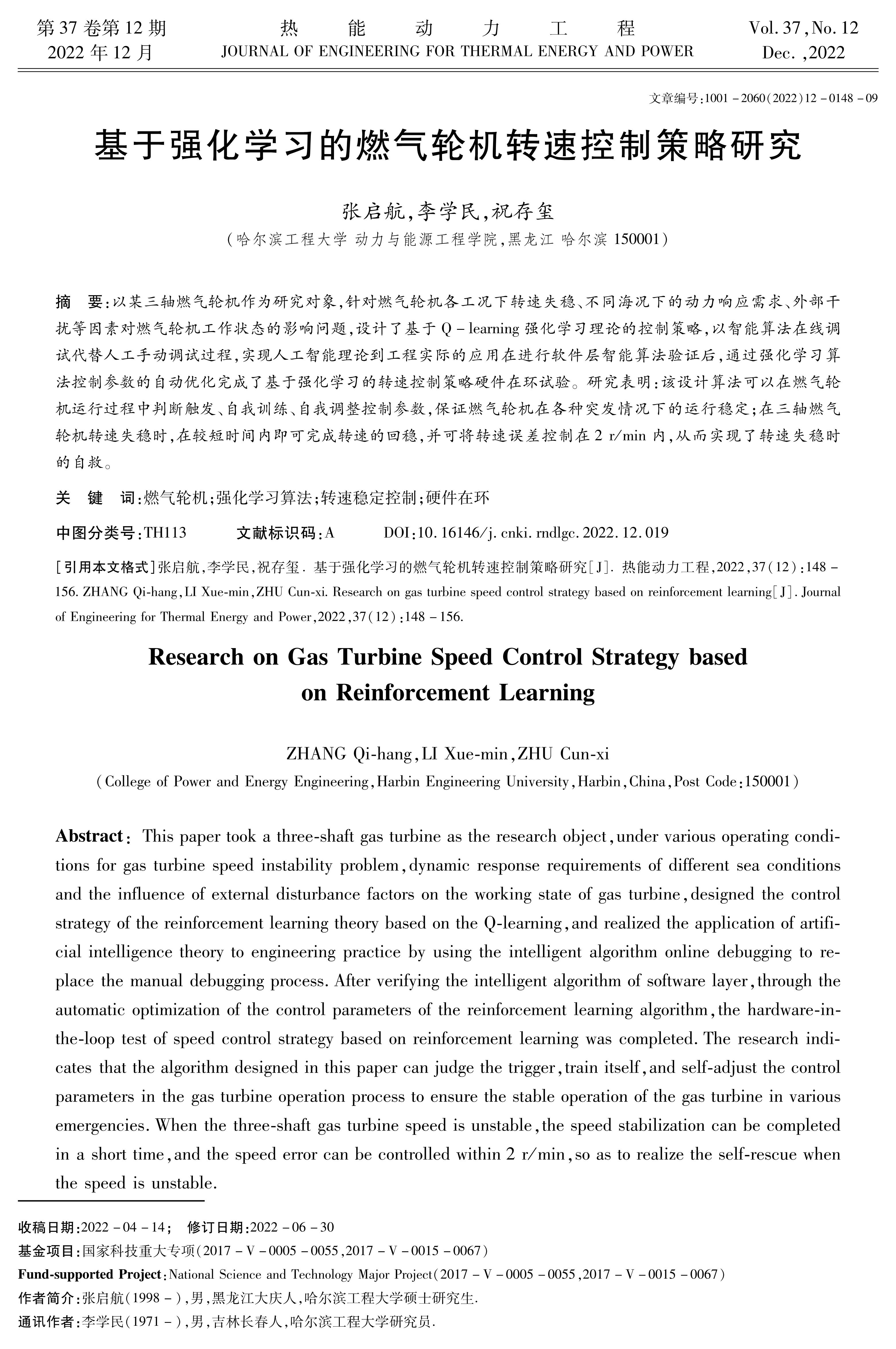 This paper took a threeshaft gas turbine as the research object,under various operating conditions for gas turbine speed instability problem,dynamic response requirements of different sea conditions and the influence of external disturbance factors on the working state of gas turbine,designed the control strategy of the reinforcement learning theory based on the Qlearning,and realized the application of artificial intelligence theory to engineering practice by using the intelligent algorithm online debugging to replace the manual debugging process.After verifying the intelligent algorithm of software layer,through the automatic optimization of the control parameters of the reinforcement learning algorithm,the hardwareintheloop test of speed control strategy based on reinforcement learning was completed.The research indicates that the algorithm designed in this paper can judge the trigger,train itself,and selfadjust the control parameters in the gas turbine operation process to ensure the stable operation of the gas turbine in various emergencies.When the threeshaft gas turbine speed is unstable,the speed stabilization can be completed in a short time,and the speed error can be controlled within 2 r/min,so as to realize the selfrescue when the speed is unstable.