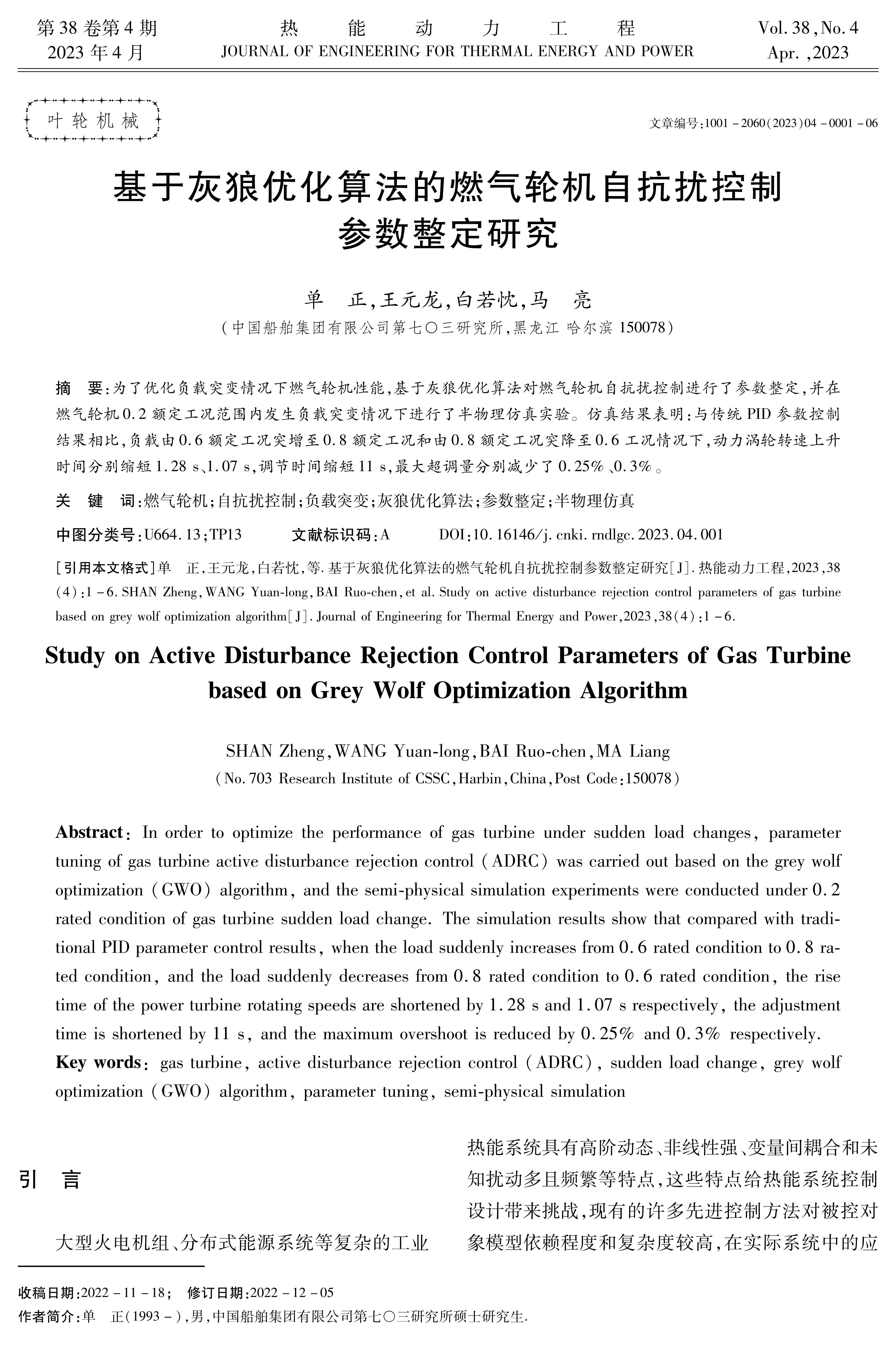 为了优化负载突变情况下燃气轮机性能,基于灰狼优化算法对燃气轮机自抗扰控制进行了参数整定,并在燃气轮机0.2额定工况范围内发生负载突变情况下进行了半物理仿真实验。仿真结果表明:与传统PID参数控制结果相比,负载由0.6额定工况突增至0.8额定工况和由0.8额定工况突降至0.6工况情况下,动力涡轮转速上升时间分别缩短1.28 s、1.07 s,调节时间缩短11 s,最大超调量分别减少了0.25%、0.3%。