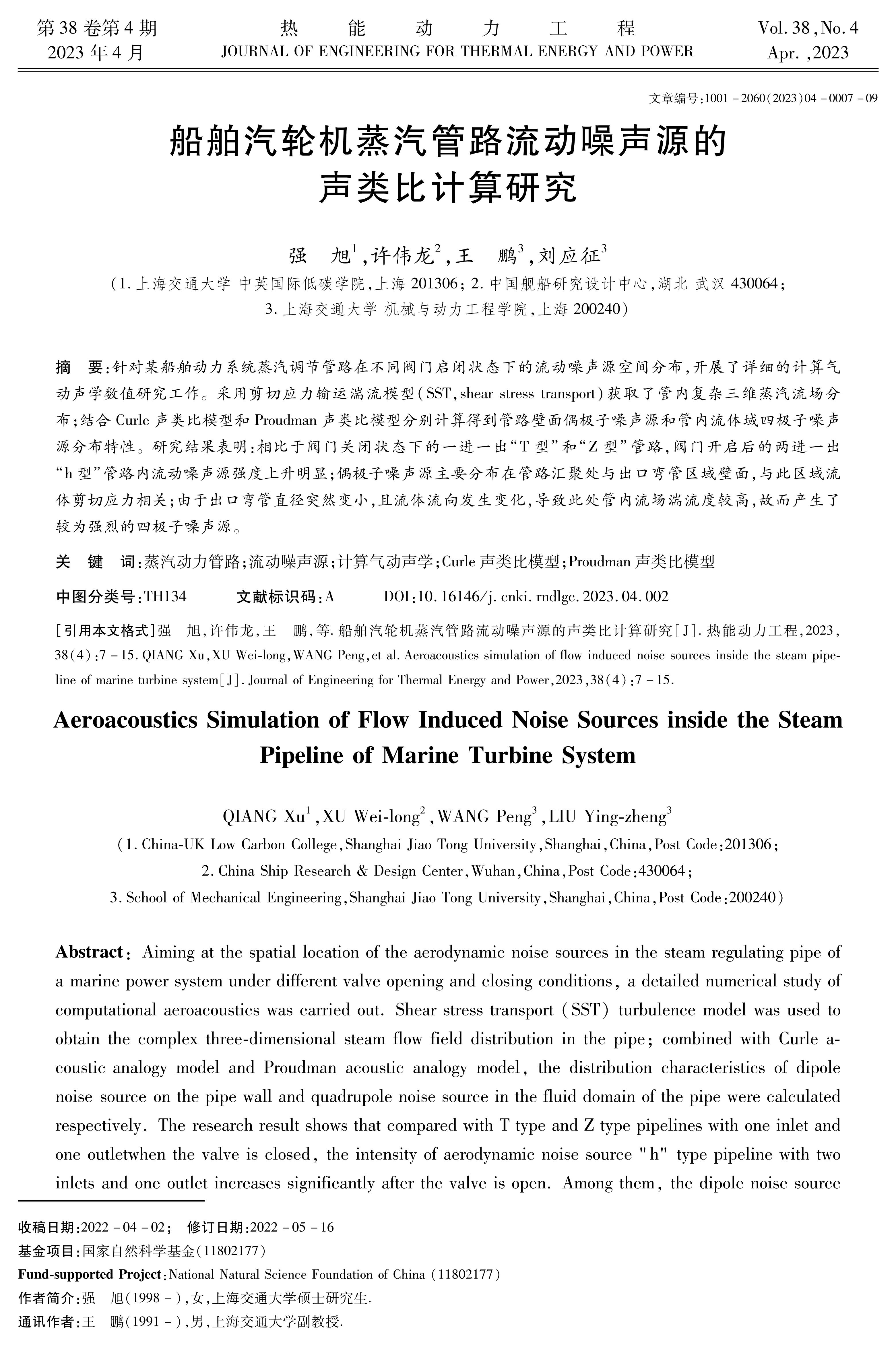 Aiming at the spatial location of the aerodynamic noise sources in the steam regulating pipe of a marine power system under different valve opening and closing conditions, a detailed numerical study of computational aeroacoustics was carried out. Shear stress transport (SST) turbulence model was used to obtain the complex threedimensional steam flow field distribution in the pipe; combined with Curle acoustic analogy model and Proudman acoustic analogy model, the distribution characteristics of dipole noise source on the pipe wall and quadrupole noise source in the fluid domain of the pipe were calculated respectively. The research result shows that compared with T type and Z type pipelines with one inlet and one outletwhen the valve is closed, the intensity of aerodynamic noise source "h" type pipeline with two inlets and one outlet increases significantly after the valve is open. Among them, the dipole noise source is mainly distributed in the pipeline convergence and the wall of outlet elbow area, which is closely related to the local fluid shear stress. The quadrupole noise source is mainly located in the outlet elbow, which is strongly related to higher turbulent kinetic energy distribution of flow field in pipe caused by suddenly becoming small of elbow diameter and the change of flow direction.