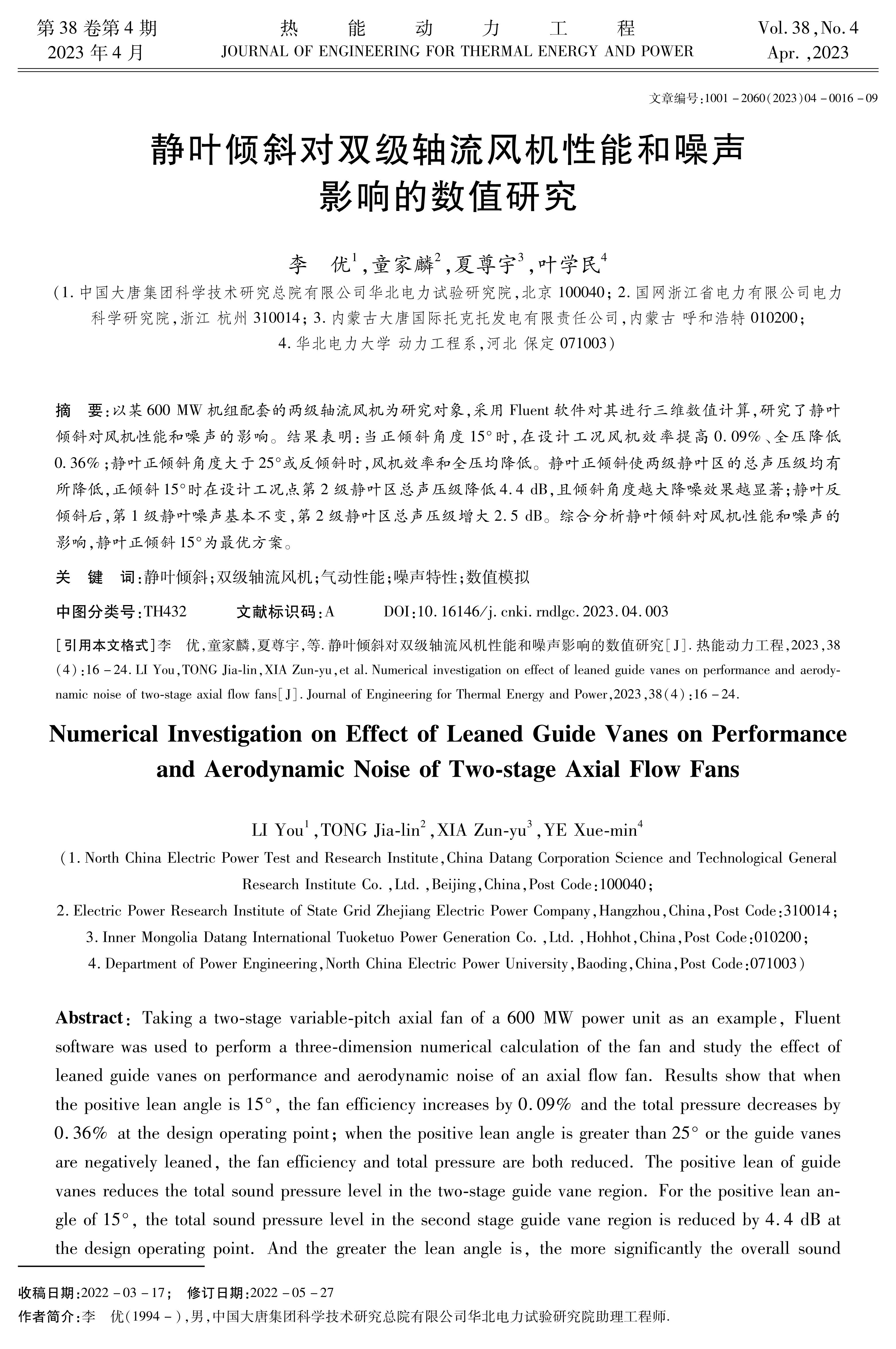 Taking a twostage variablepitch axial fan of a 600 MW power unit as an example, Fluent software was used to perform a threedimension numerical calculation of the fan and study the effect of leaned guide vanes on performance and aerodynamic noise of an axial flow fan. Results show that when the positive lean angle is 15°, the fan efficiency increases by 0.09% and the total pressure decreases by 0.36% at the design operating point; when the positive lean angle is greater than 25° or the guide vanes are negatively leaned, the fan efficiency and total pressure are both reduced. The positive lean of guide vanes reduces the total sound pressure level in the twostage guide vane region. For the positive lean angle of 15°, the total sound pressure level in the second stage guide vane region is reduced by 4.4 dB at the design operating point. And the greater the lean angle is, the more significantly the overall sound pressure level decreases. After the guide vanes are negatively leaned, the noise of the first stage guide vanes is roughly unchanged, and the overall sound pressure level of the second stage guide vane region increases by 2.5 dB. Considering the influence of leaned guide vanes on fan performance and aerodynamic noise, the positively leaned guide vane of 15° is the optimal scheme.