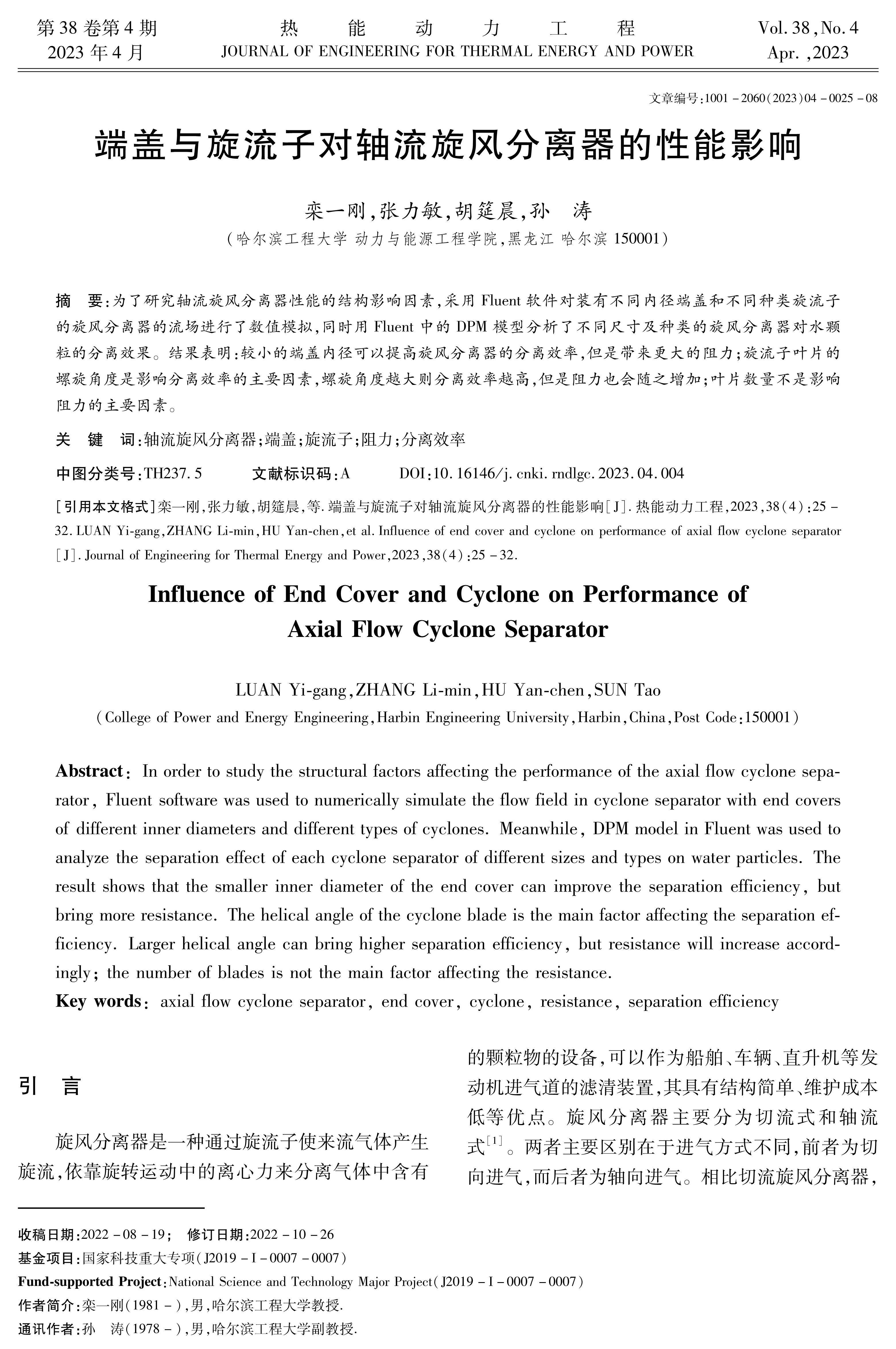 In order to study the structural factors affecting the performance of the axial flow cyclone separator, Fluent software was used to numerically simulate the flow field in cyclone separator with end covers of different inner diameters and different types of cyclones. Meanwhile, DPM model in Fluent was used to analyze the separation effect of each cyclone separator of different sizes and types on water particles. The result shows that the smaller inner diameter of the end cover can improve the separation efficiency, but bring more resistance. The helical angle of the cyclone blade is the main factor affecting the separation efficiency. Larger helical angle can bring higher separation efficiency, but resistance will increase accordingly; the number of blades is not the main factor affecting the resistance.