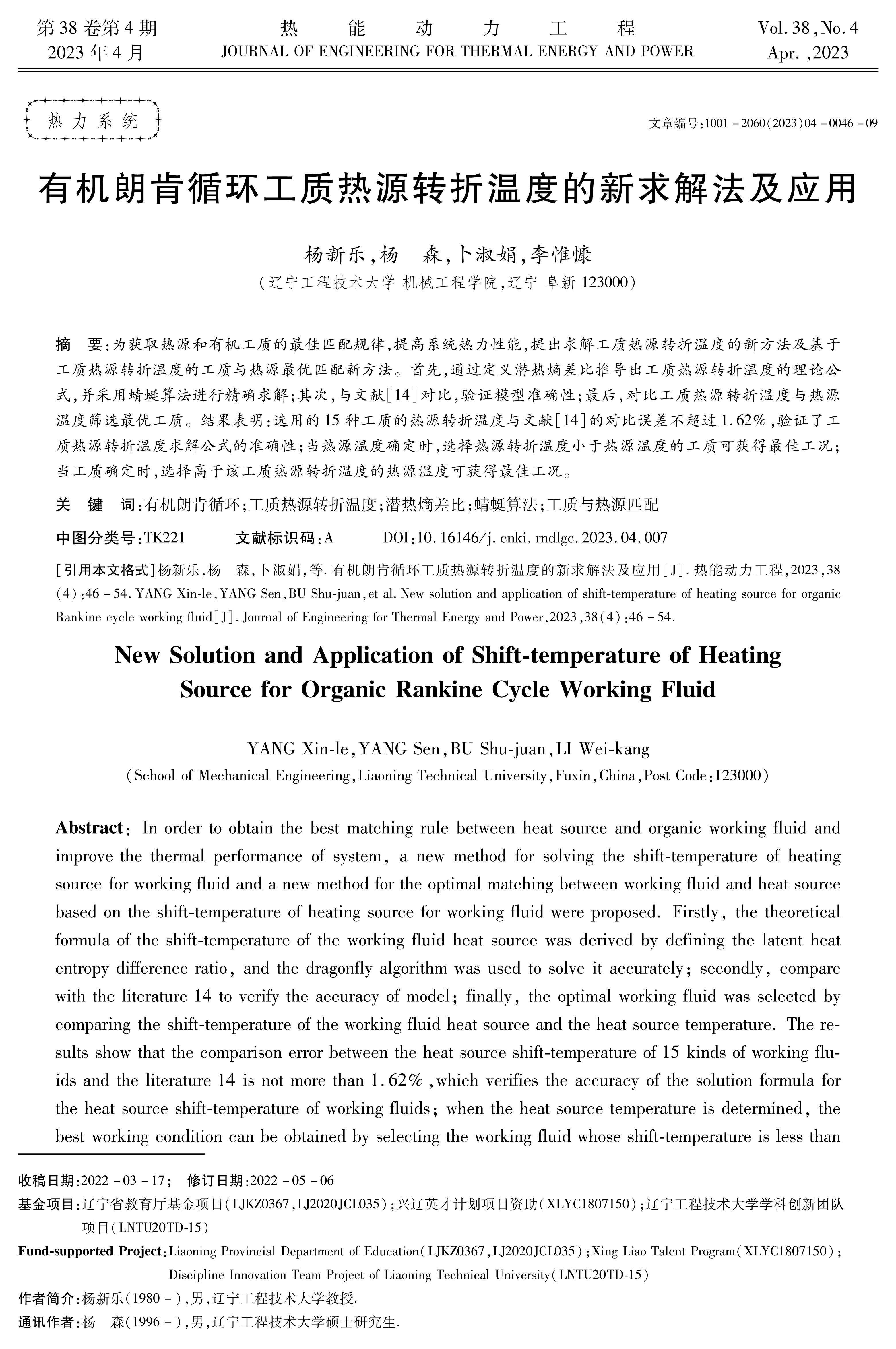 为获取热源和有机工质的最佳匹配规律,提高系统热力性能,提出求解工质热源转折温度的新方法及基于工质热源转折温度的工质与热源最优匹配新方法。首先,通过定义潜热熵差比推导出工质热源转折温度的理论公式,并采用蜻蜓算法进行精确求解;其次,与文献[14]对比,验证模型准确性;最后,对比工质热源转折温度与热源温度筛选最优工质。结果表明:选用的15种工质的热源转折温度与文献[14]的对比误差不超过1.62%,验证了工质热源转折温度求解公式的准确性;当热源温度确定时,选择热源转折温度小于热源温度的工质可获得最佳工况;当工质确定时,选择高于该工质热源转折温度的热源温度可获得最佳工况。