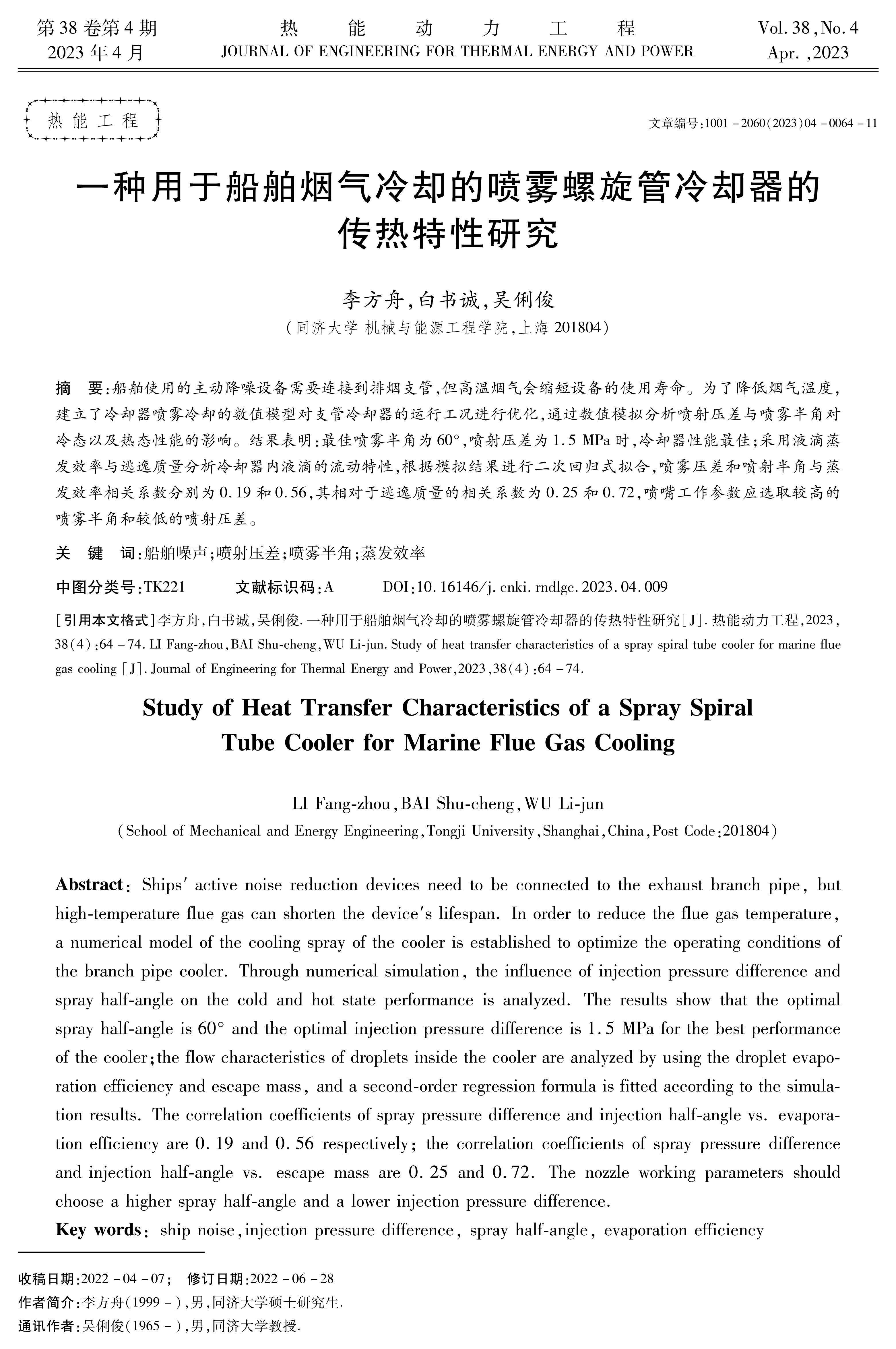 Ships′ active noise reduction devices need to be connected to the exhaust branch pipe, but hightemperature flue gas can shorten the device′s lifespan. In order to reduce the flue gas temperature, a numerical model of the cooling spray of the cooler is established to optimize the operating conditions of the branch pipe cooler. Through numerical simulation, the influence of injection pressure difference and spray halfangle on the cold and hot state performance is analyzed. The results show that the optimal spray halfangle is 60° and the optimal injection pressure difference is 1.5 MPa for the best performance of the cooler;the flow characteristics of droplets inside the cooler are analyzed by using the droplet evaporation efficiency and escape mass, and a secondorder regression formula is fitted according to the simulation results. The correlation coefficients of spray pressure difference and injection halfangle vs. evaporation efficiency are 0.19 and 0.56 respectively;the correlation coefficients of spray pressure difference and injection halfangle vs. escape mass are 0.25 and 0.72. The nozzle working parameters should choose a higher spray halfangle and a lower injection pressure difference.