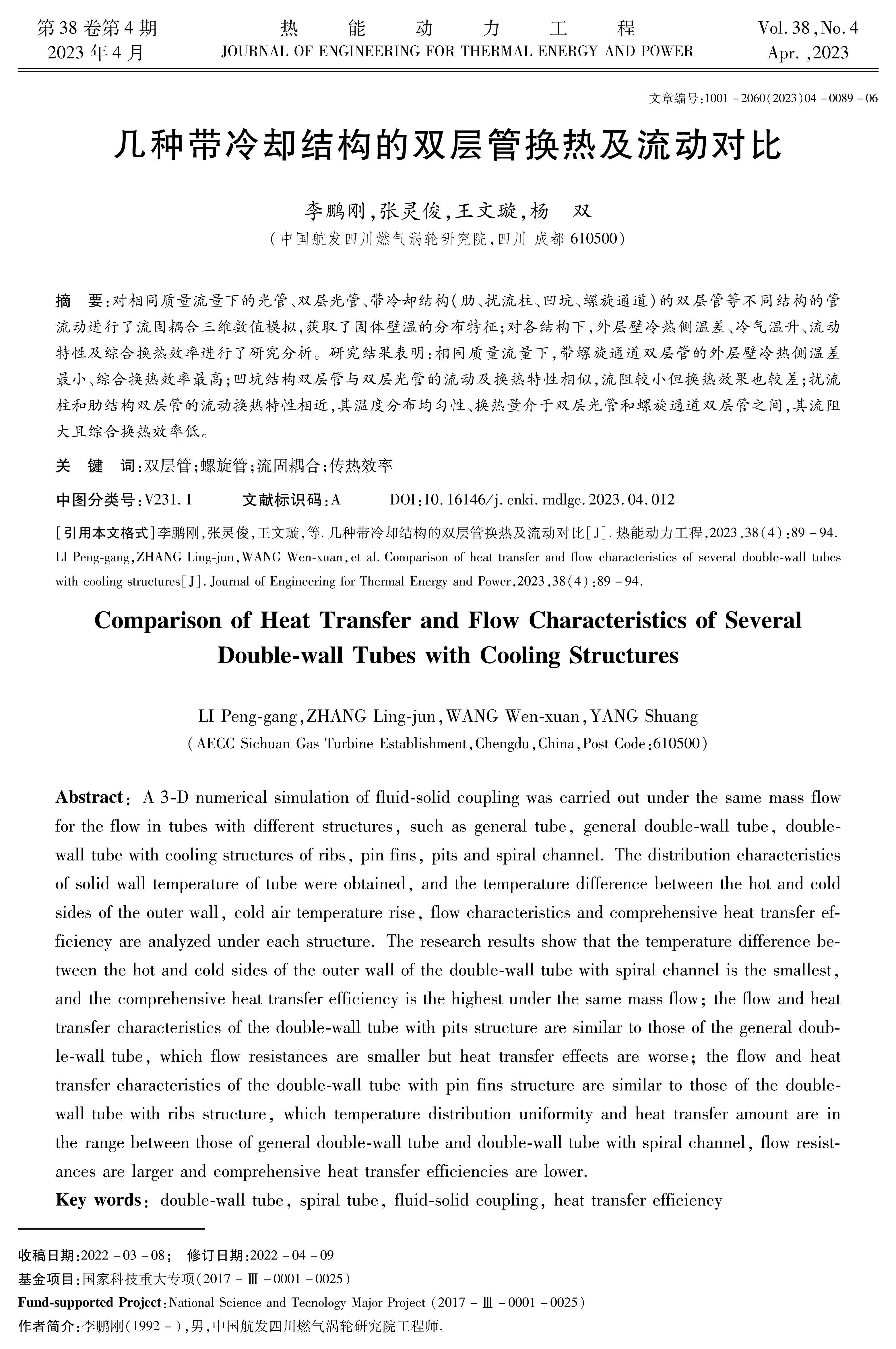 对相同质量流量下的光管、双层光管、带冷却结构(肋、扰流柱、凹坑、螺旋通道)的双层管等不同结构的管流动进行了流固耦合三维数值模拟,获取了固体壁温的分布特征;对各结构下,外层壁冷热侧温差、冷气温升、流动特性及综合换热效率进行了研究分析。研究结果表明:相同质量流量下,带螺旋通道双层管的外层壁冷热侧温差最小、综合换热效率最高;凹坑结构双层管与双层光管的流动及换热特性相似,流阻较小但换热效果也较差;扰流柱和肋结构双层管的流动换热特性相近,其温度分布均匀性、换热量介于双层光管和螺旋通道双层管之间,其流阻大且综合换热效率低。