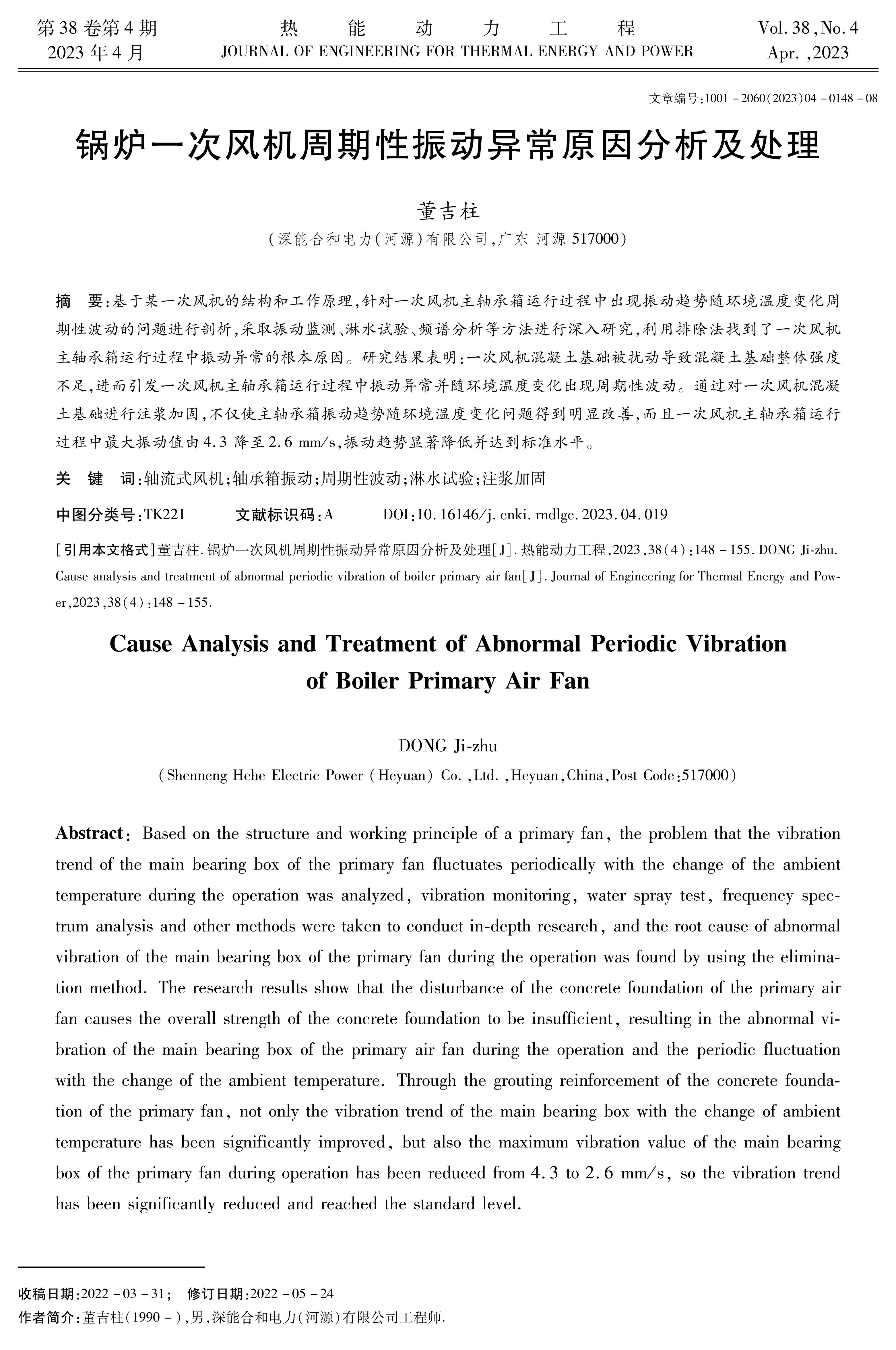 Based on the structure and working principle of a primary fan, the problem that the vibration trend of the main bearing box of the primary fan fluctuates periodically with the change of the ambient temperature during the operation was analyzed, vibration monitoring, water spray test, frequency spectrum analysis and other methods were taken to conduct indepth research, and the root cause of abnormal vibration of the main bearing box of the primary fan during the operation was found by using the elimination method. The research results show that the disturbance of the concrete foundation of the primary air fan causes the overall strength of the concrete foundation to be insufficient, resulting in the abnormal vibration of the main bearing box of the primary air fan during the operation and the periodic fluctuation with the change of the ambient temperature. Through the grouting reinforcement of the concrete foundation of the primary fan, not only the vibration trend of the main bearing box with the change of ambient temperature has been significantly improved, but also the maximum vibration value of the main bearing box of the primary fan during operation has been reduced from 4.3 to 2.6 mm/s, so the vibration trend has been significantly reduced and reached the standard level.