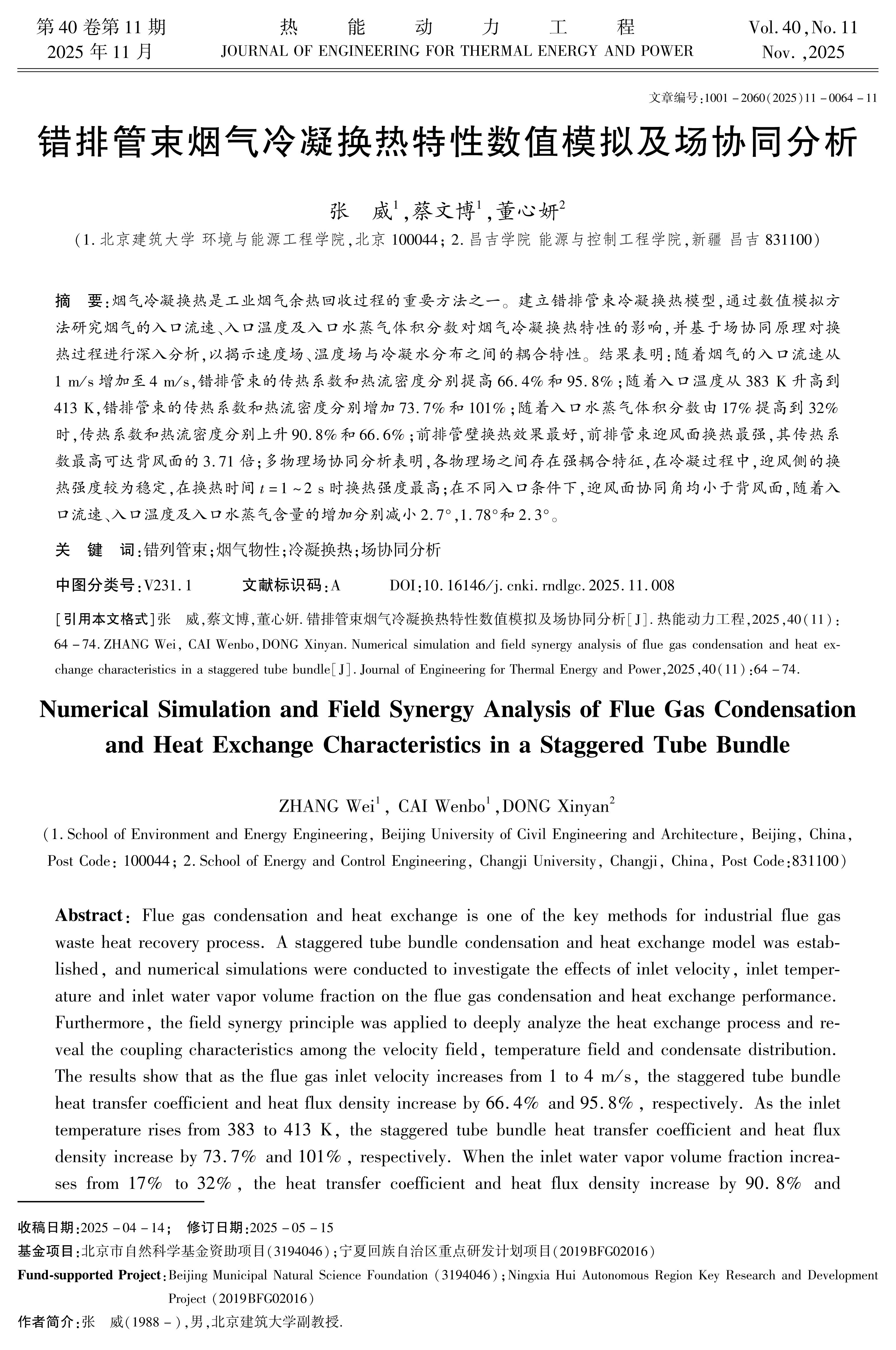 错排管束烟气冷凝换热特性数值模拟及场协同分析