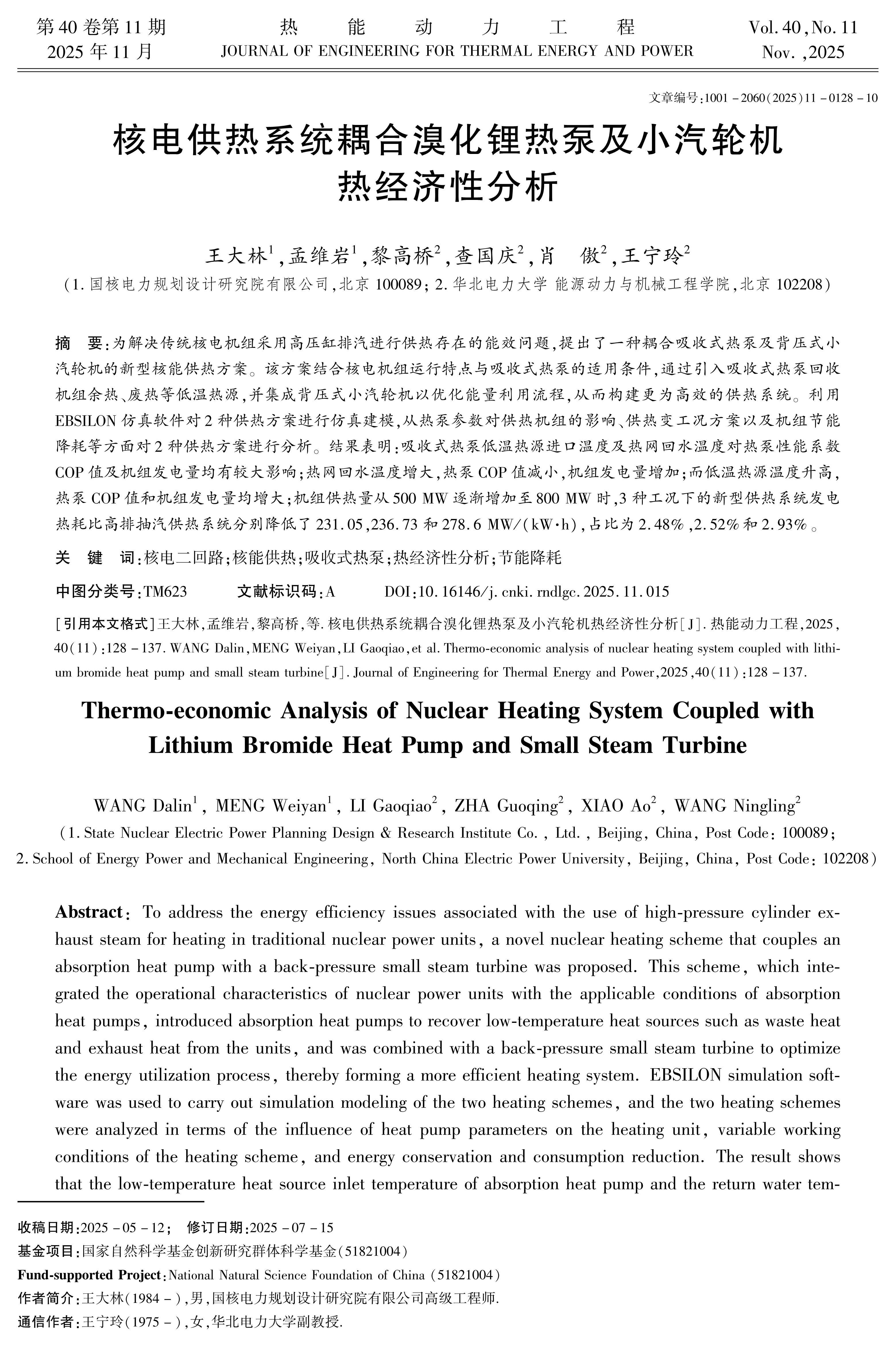 吸收式热泵技术在传统热电联产机组余热、废热等低温热源回收领域中应用十分广泛,但由于核能供热起步较晚,所以对于吸收式热泵的应用较少。从某核电机组供热的角度,结合机组特点与吸收式热泵适用条件,针对目前供热方式存在的问题,提出了耦合吸收式热泵及背压式小汽轮机的核能供热方案。利用EBSILON仿真软件对2种供热方案进行仿真建模,从热泵参数对供热机组的影响、供热方案变工况分析、节能降耗分析对2种供热方案进行分析。通过研究发现,吸收式热泵低温热源进口温度及热网回水温度对热泵性能系数COP值和机组发电量均有较大影响。热网回水温度增大,热泵COP值减小,机组发电量增加;低温热源温度升高,热泵COP值和机组发电量均增大。在设计供热量为500MW时,三种工况下新型供热系统发电热耗比高排抽汽供热系统分别降低了231.05 MW/(kW·h)、236.73 MW/(kW·h)和278.6 MW/(kW·h),占比为2.48%、2.52%和2.93%。