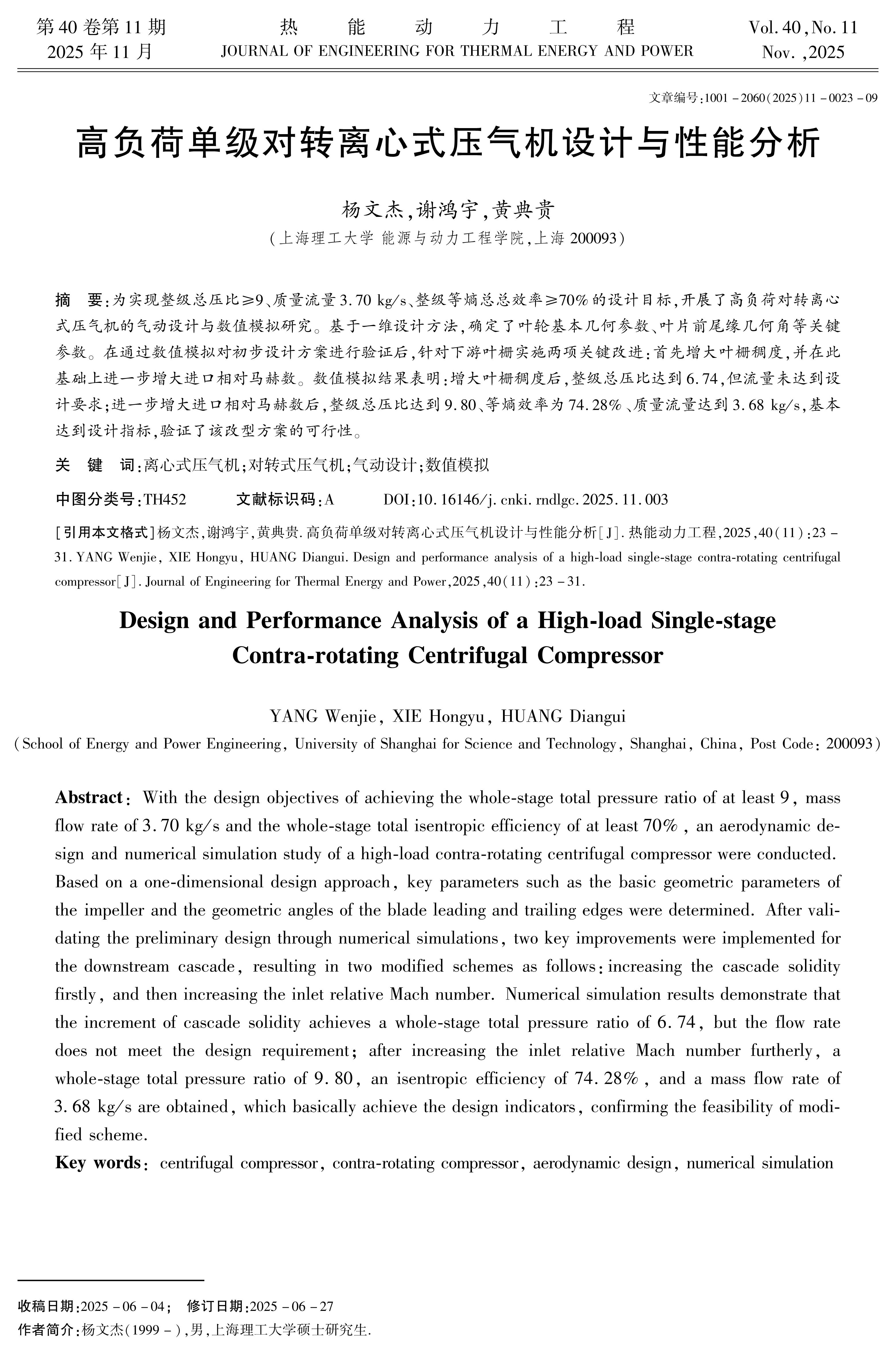 Centrifugal compressors have been widely used in small and medium-sized aviation power plants due to their relatively large single-stage pressure ratio. The contra-rotating compressor achieves high-pressure ratio output through the coordinated reverse rotation of two sets of rotors. the design objectives are set as a total pressure ratio of the entire stage ≥ 9.00, a mass flow rate of 3.70 kg/s, and an isentropic total efficiency of the entire stage ≥ 70.00%. Carry out the aerodynamic design and numerical simulation research on the high-load contra-rotating centrifugal compressor. Based on the one-dimensional design method, determine the key parameters such as the basic geometric parameters of the impeller and the geometric angles of the leading and trailing edges of the blades. After verifying the preliminary design scheme through numerical simulation, Implement two key improvements for the downstream cascade. Two modified schemes are obtained. The results of the numerical simulation show that: The total pressure ratio and flow rate parameters of the improved design scheme both meet the design requirements. It verifies the feasibility of the proposed design method.