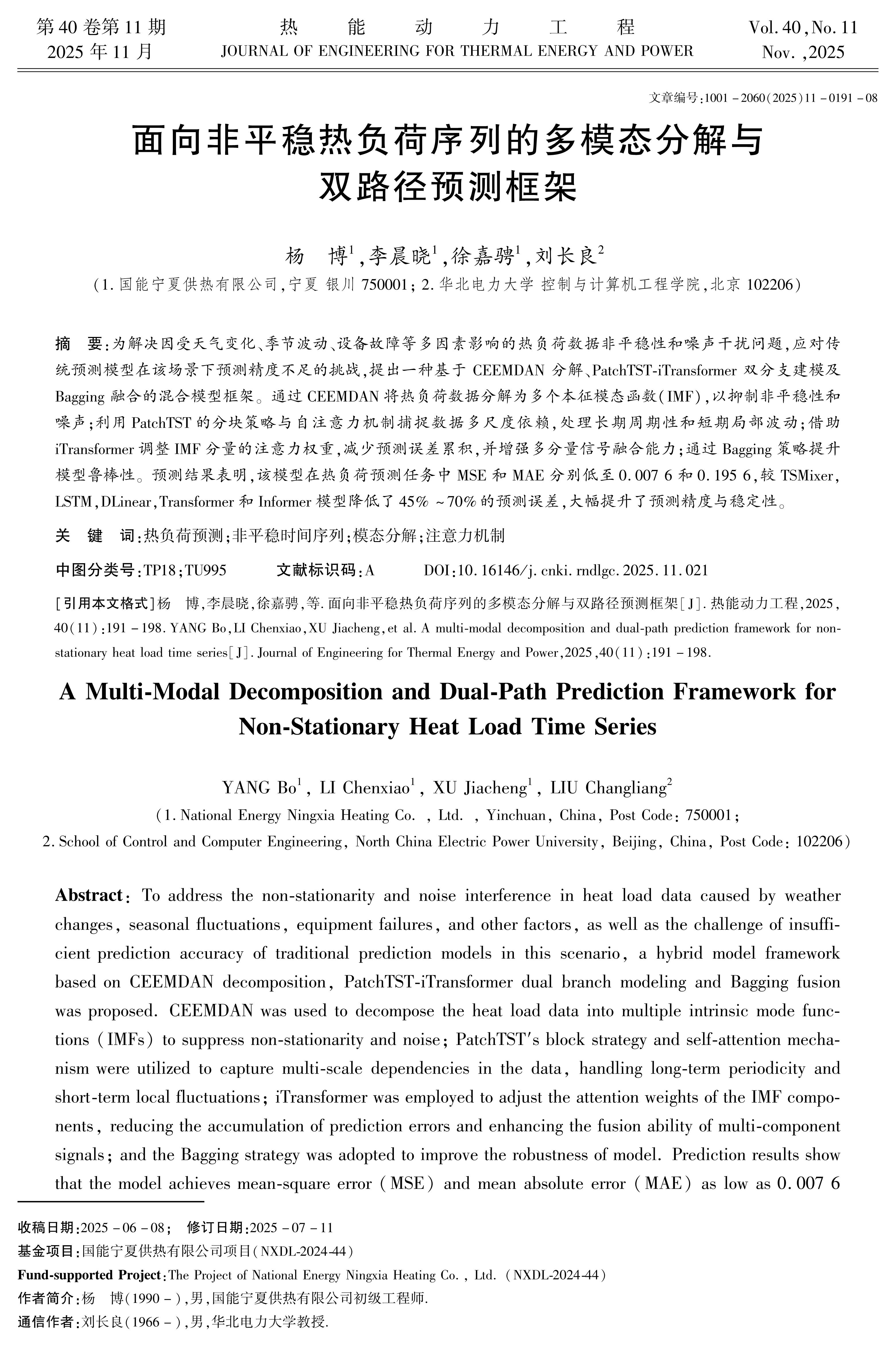为解决热负荷数据因受天气变化、季节波动、设备故障等多因素影响而呈现的非平稳性和噪声干扰问题,以及传统预测模型在该场景下精度不足的挑战,提出一种基于 CEEMDAN 分解、PatchTST 和 iTransformer 的混合模型框架,并结合 Bagging 融合策略。通过 CEEMDAN 将热负荷数据分解为多个本征模态函数(IMF)以抑制非平稳性和噪声;利用 PatchTST 的分块策略与自注意力机制捕捉数据多尺度依赖,处理长期周期性和短期局部波动;借助 iTransformer 调整 IMF 分量的注意力权重,减少预测误差累积并增强多分量信号融合能力;通过 Bagging 策略提升模型鲁棒性。实验结果表明,该模型在热负荷预测任务中 MSE 和 MAE 分别低至 0.0076 和 0.1956,显著优于传统方法和现有 SOTA 模型。该模型构建了多模态分解与双路径预测的协同框架,整合模态分解、多尺度依赖建模、注意力权重调整及集成学习,有效应对非平稳热负荷序列的预测难题,大幅提升了预测精度与稳定性。