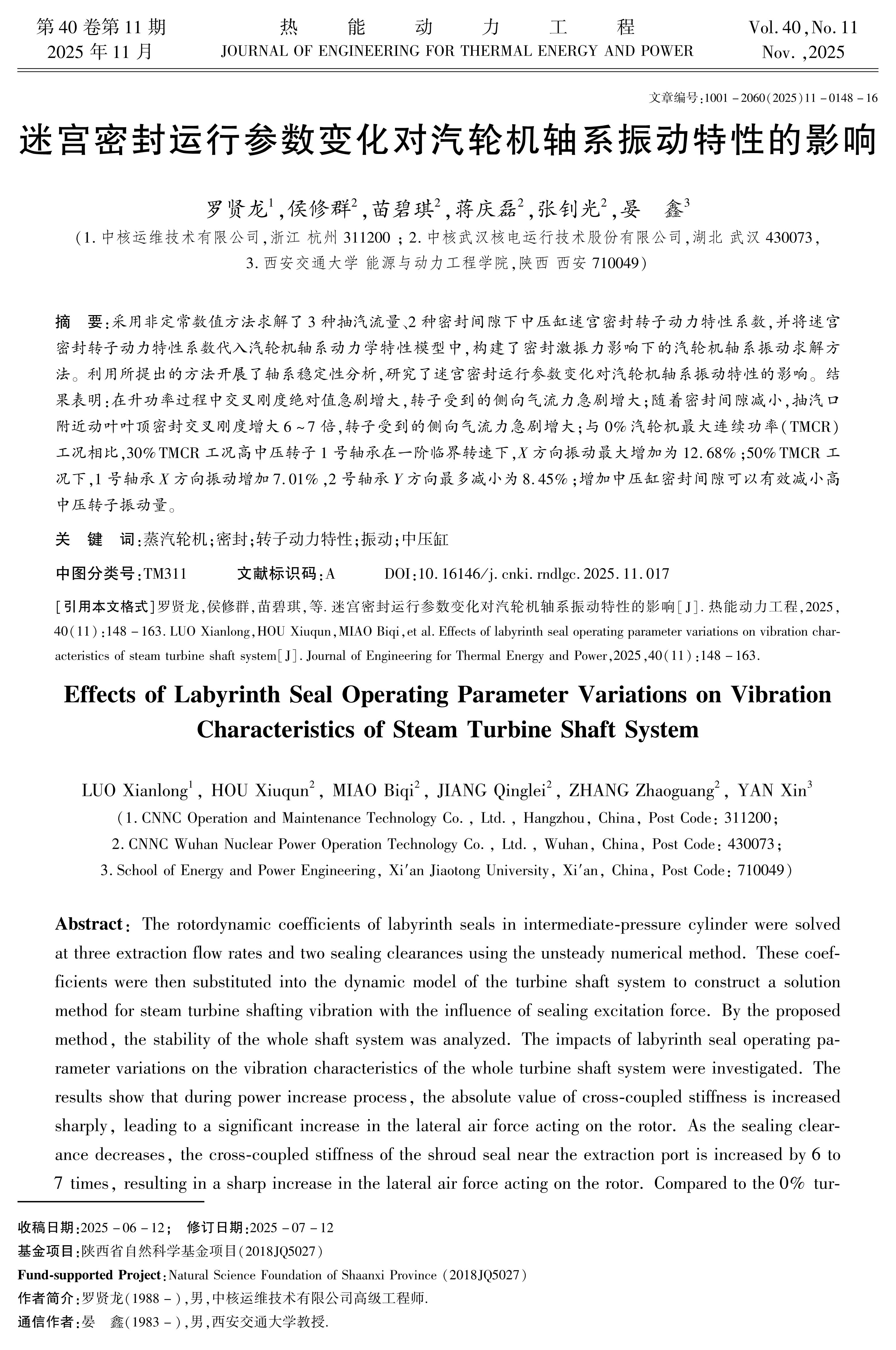 The rotordynamic coefficients of labyrinth seals in intermediate pressure cylinder were solved at three extraction flow rates and two sealing clearances using the unsteady numerical method. These coefficients were then substituted into the dynamic model of the turbine shaft system to analyze the stability of the whole shaft system. The impacts of labyrinth seals operating parameters on the vibration characteristics of the whole turbine shaft system were investigated. The results showed that during power increase process, the cross-coupled stiffness (negative value) is increased sharply, leading to a significant increase in the lateral fluid force acting on the rotor.? As the sealing clearance decreases, the cross-coupled stiffness of the shroud seal near the extraction port is increased by 6 to 7 times, resulting in a sharp increase in the lateral fluid force acting on the rotor.? Compared to the 0%TMCR condition, the vibration in the X direction of the high-pressure and intermediate-pressure rotors" #1 bearing at the first critical speed is increased by up to 12.68% under the 30%TMCR condition. Under the 50%TMCR condition, the vibration in the X direction of #1bearing is increased by 7.01%, while the Y direction of 2# bearing is decreased by up to 8.45%. Increasing the sealing clearance of the intermediate-pressure cylinder can effectively reduce the vibrations of rotors in high-pressure and intermediate-pressure cylinders.
