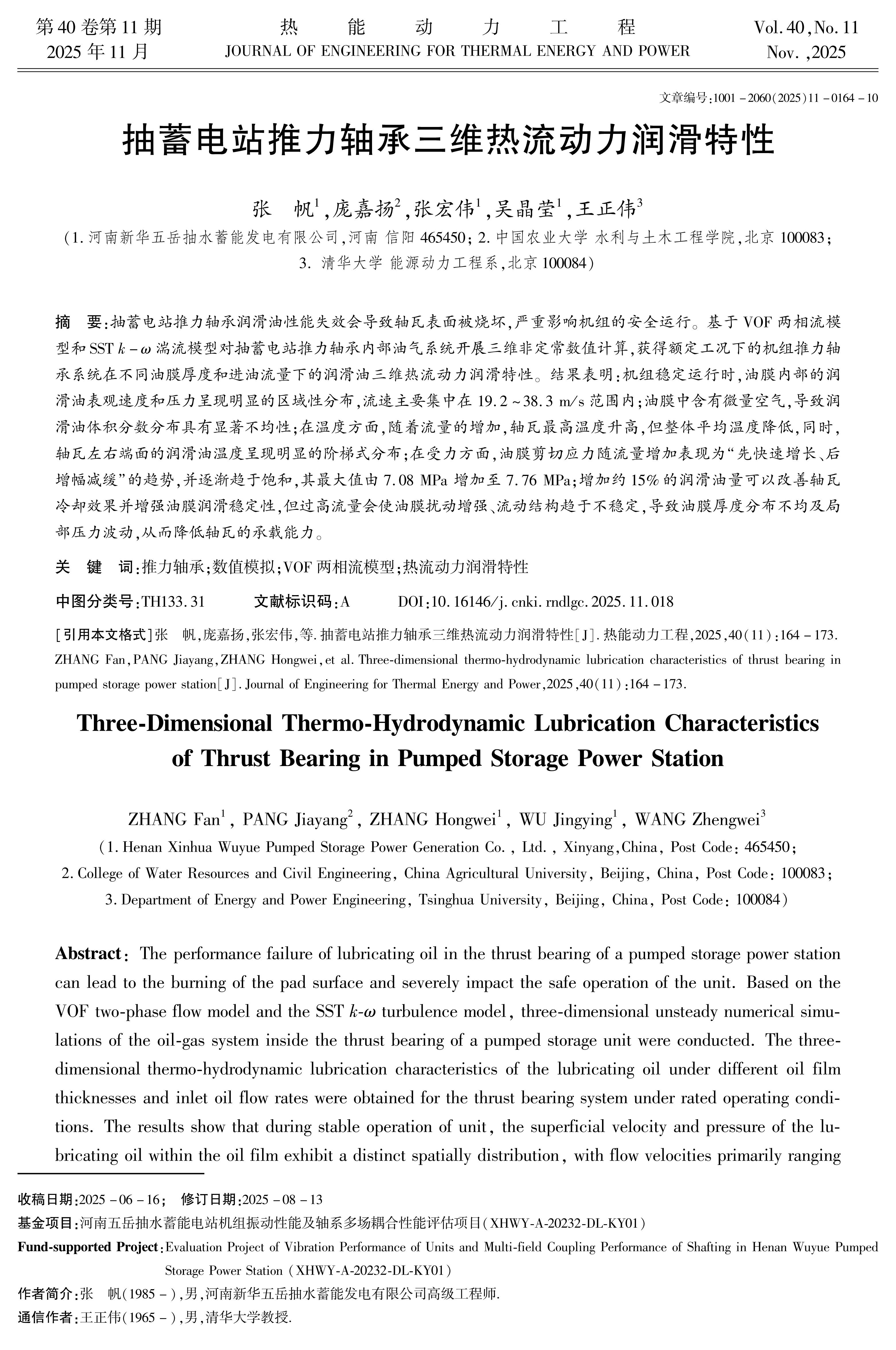 抽蓄电站推力轴承润滑油性能失效会严重影响机组的安全运行,导致轴瓦表面被烧坏。基于VOF两相流模型和SST k-ω湍流模型对抽蓄电站推力轴承内部油气系统开展三维非定常数值计算,获得额定工况下的机组推力轴承系统润滑油三维热流动力润滑特性。结果表明:机组稳定运行时,油膜内部的润滑油表观速度和压力呈现明显的区域性分布,润滑油流速主要处于19.2~38.3 m/s。油膜内含有微量空气,润滑油体积分数分布明显,随着流量增大,瓦面最高温度增大但整体温度(平均温度)降低,轴瓦左右端面润滑油温度呈现明显阶梯分布。油膜剪切应力随流量增加呈现出“先快速增长,后增幅减缓”的趋势,逐渐趋于饱和,最大剪切应力由7.08 Mpa增加至7.76 Mpa。研究结果为进一步提升水轮机推力轴承润滑性能和油雾抑制研究提供理论基础。