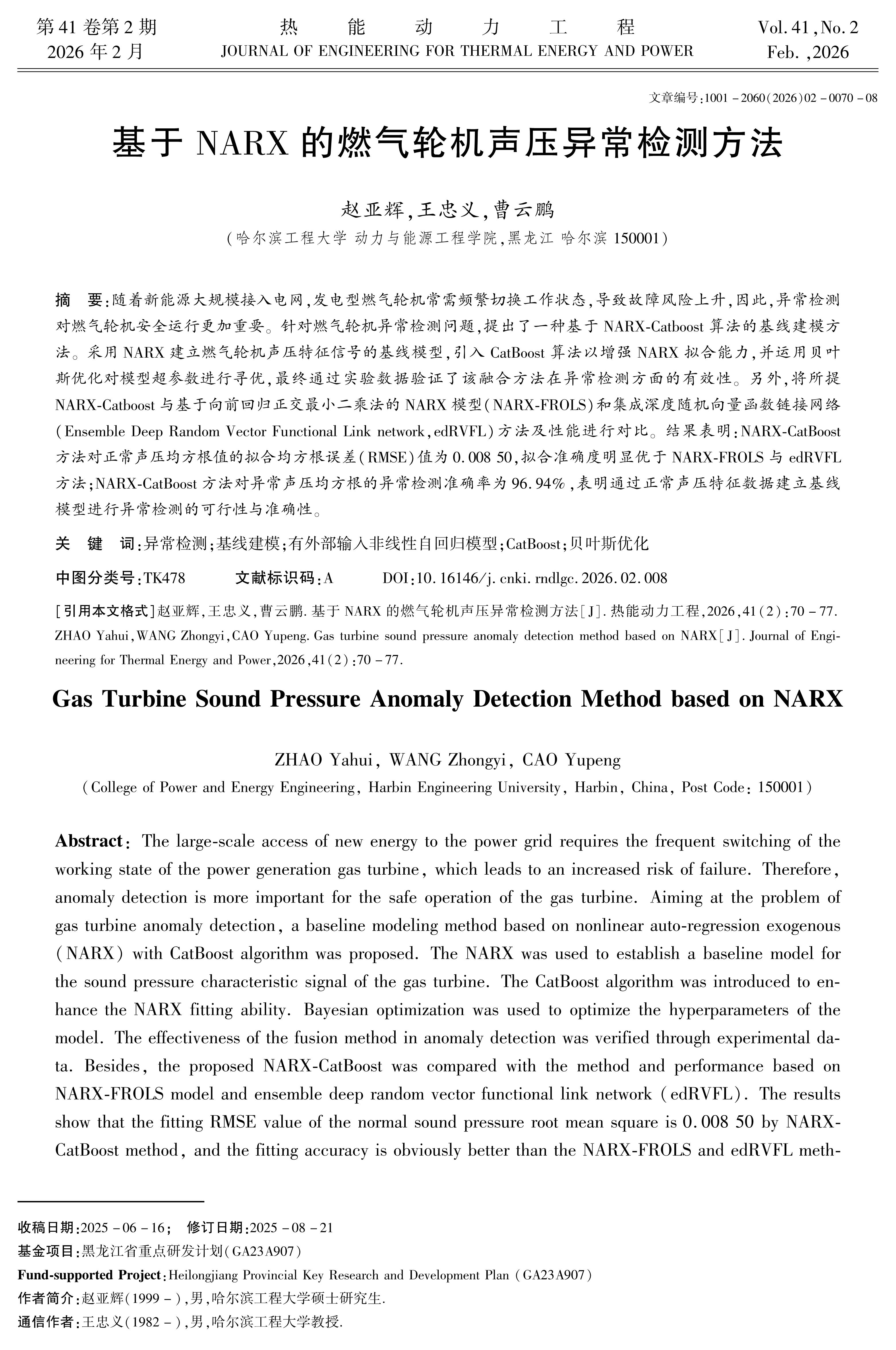 新能源大规模接入电网,要求发电型燃气轮机频繁切换工作状态,更容易发生故障,异常检测对燃气轮机安全运行更加重要。针对燃气轮机异常检测问题,提出了一种基于NARX的基线建模方法。利用NARX模型对燃气轮机声压特征信号建立基线模型,利用CatBoost算法增强NARX拟合效果,利用贝叶斯优化对模型超参数优化,增强模型泛化能力,使用燃气轮机实机数据进行测试。结果表明:NARX-CatBoost方法明显优于NARX-FROLS和edRVFL方法。该方法对正常声压均方根的拟合RMSE值0.00850,拟合准确度明显优于其他方法;该方法对异常声压均方根的异常检测准确率为96.94%,说明通过正常声压特征数据建立基线模型进行异常检测的可行性与准确性。