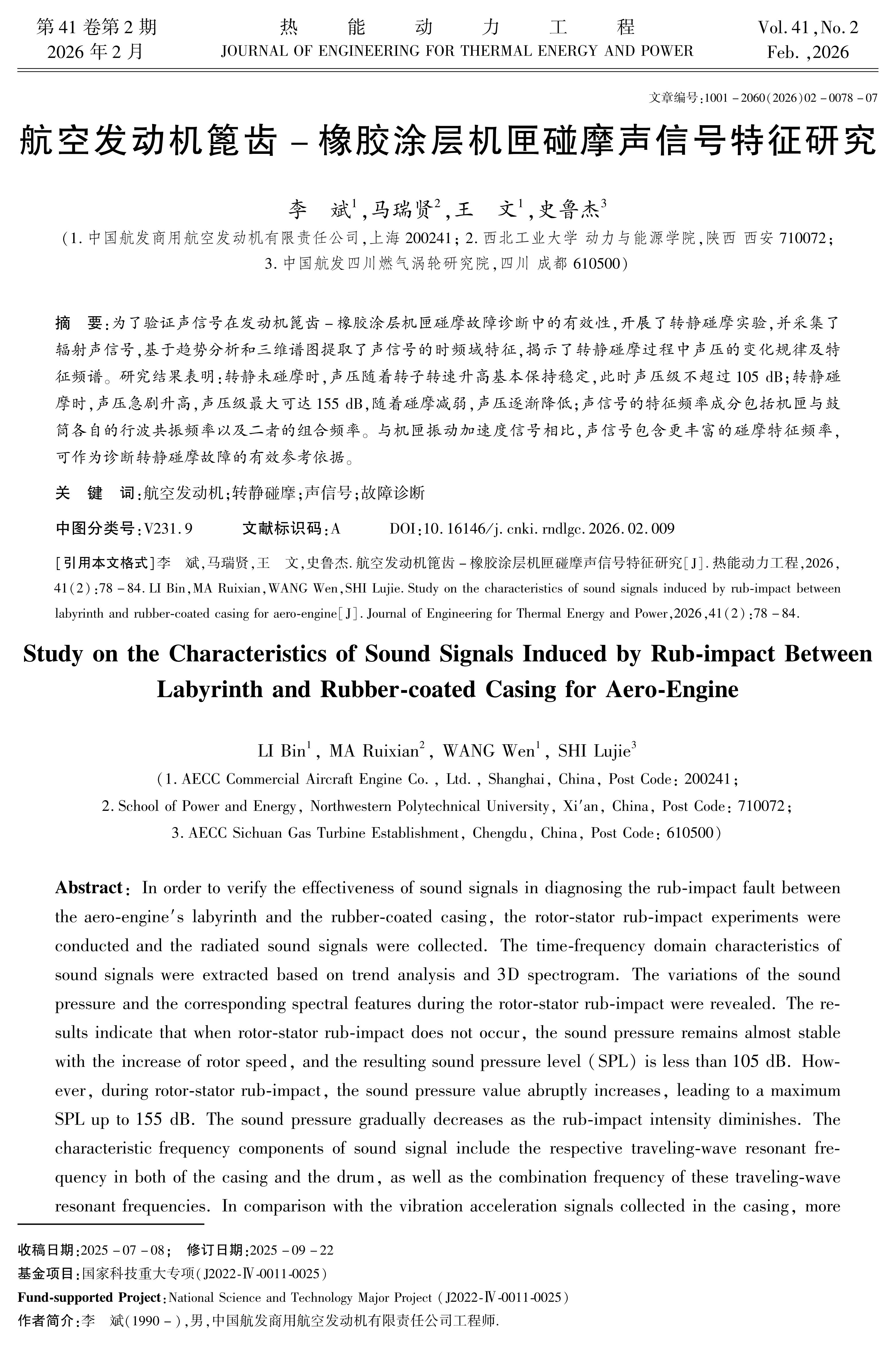 以航空发动机篦齿-橡胶涂层机匣转静碰摩故障为研究对象,开展了转静碰摩实验,采集了碰摩所产生的辐射声信号,基于趋势分析和三维谱图提取了声信号的时频域特征,获得了转静碰摩过程中声压的变化规律及特征频谱。研究结果表明,转静未碰摩时,声压随着转子转速升高基本保持稳定,此时声压级不超过105dB。转静碰摩时,声压急剧升高,声压级最大可达157dB,随着碰摩减弱,声压逐渐降低。转静碰摩声信号的特征频率成分包括转静子耦合共振引起的机匣及鼓筒行波共振频率,还可捕捉到机匣及鼓筒行波共振频率的组合频率。与机匣振动加速度信号相比,声信号包含更丰富的碰摩特征频率。