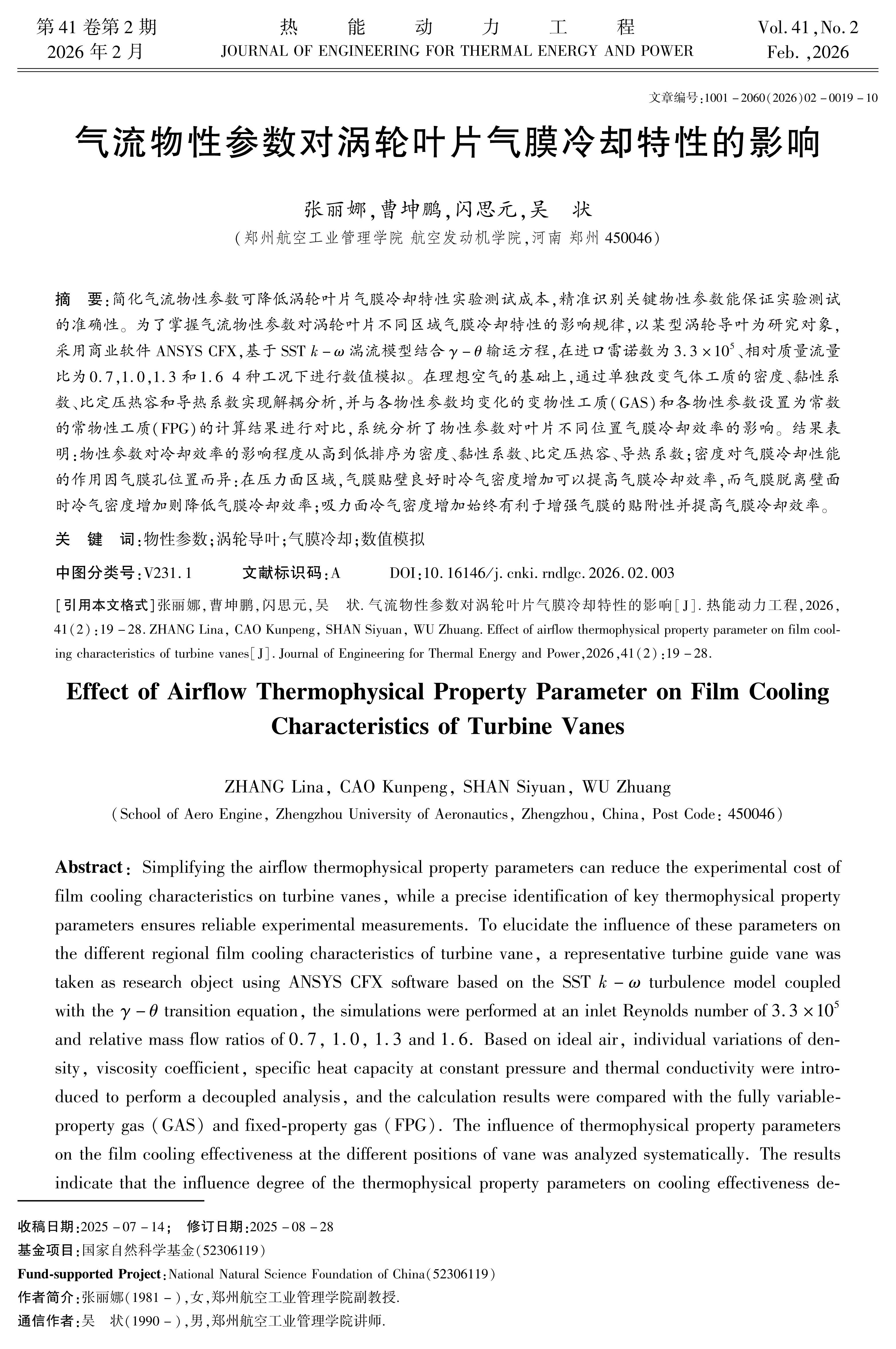 气流物性参数的选取与简化对提升涡轮叶片冷却性能预测的准确性具有重要意义。通过使用SSTk–ω 湍流模型结合γ-θ输运方程进行求解的方式研究了气流物性参数对叶片不同位置气膜冷却效率的影响。结果表明:物性参数对冷却效率的影响程度从高到低排序为密度、黏性系数、比热容、导热系数,按此优先级依次考虑各物性参数变化,可使叶片表面高温区域的分布特征接近真实工况;如果仅匹配密度参数,相对质量流量比MFRr≤1.0时,与气流工质的冷却效率偏差小于5%,相对质量流量比MFRr=1.6时,压力面和吸力面的偏差分别扩大至6.46%和12.23%;密度变化对气膜冷却性能的作用因气膜孔位置而异:压力面上密度提高仅在气膜贴壁良好时提升效率,而气膜脱离壁面时则降低效率;吸力面高密度冷气始终有利于增强贴附性并提高冷却效率。