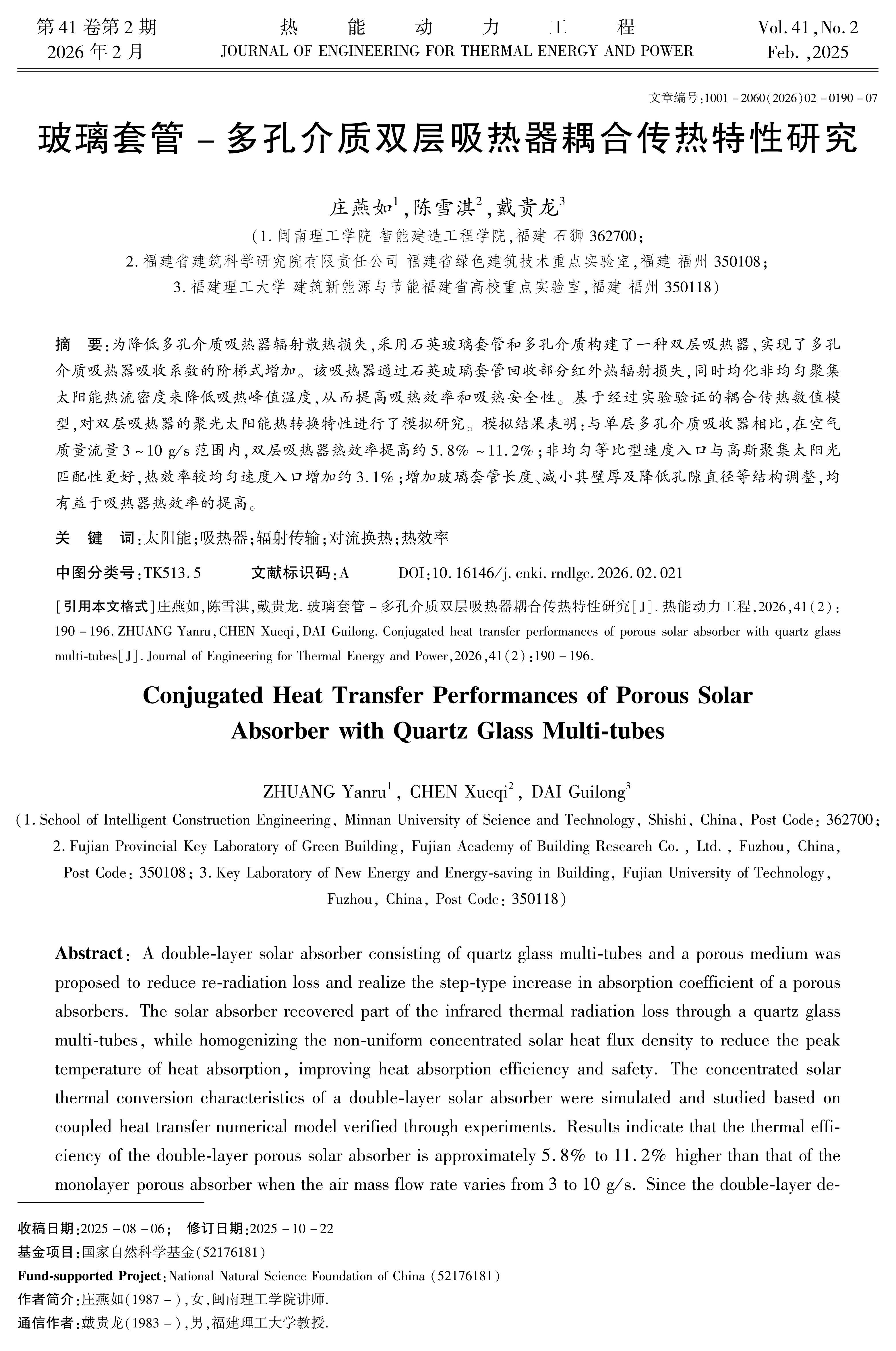 为降低多孔介质吸热器辐射散热损失,设计了一种石英玻璃套管与多孔介质吸收系数阶梯增加双层吸热器,该吸热器通过石英玻璃套管回收部分红外热辐射损失,同时均化非均匀聚集太阳能热流密度降低吸热峰值温度,提高吸热效率和吸热安全。采用耦合传热数值计算与实验验证相结合手段,对双层吸热器聚集太阳光热转换特性进行研究。结果表明:与单层多孔介质吸收器相比,在流体质量流量3~10g/s范围内双层吸热器热效率较单层提高约5.8%~11.2%;非均匀等比型速度入口与高斯聚集太阳光匹配性更好,热效率较均匀速度入口增加约3.1%。此外,增加玻璃套管长度、减小其壁厚,和减小孔隙直径等结构调整,均有益于吸热器热效率的提高。